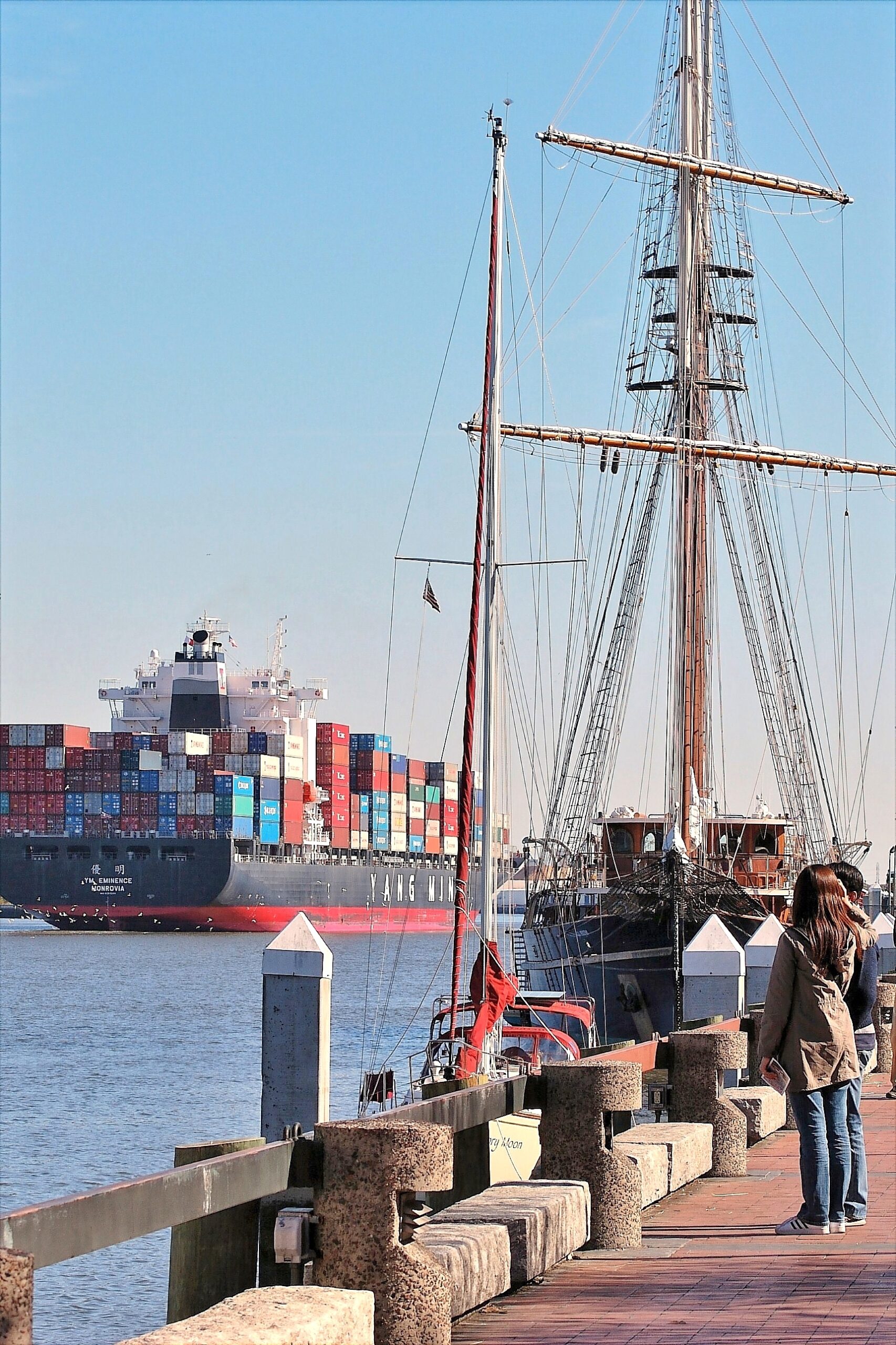 A couple of additional views from that visit some 11 years ago in Savannah. The Peacemaker on the river front in Savannah along a small sailer and a much more modern cargo vessel on the river. Also a look into the rigging of the Peacemaker.
